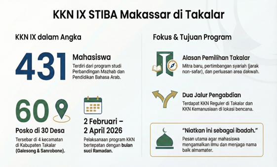(STIBA.ac.id) Makassar – Tahun ini, KKN STIBA Makassar kembali digelar saat Ramadan. Seperti beberapa tahun sebelumnya, momen KKN bertepatan dengan bulan suci. Dan untuk KKN IX kali ini, 431 mahasiswa akan tersebar di 30 desa di Kabupaten Takalar mulai 2 Februari hingga 2 April 2026.